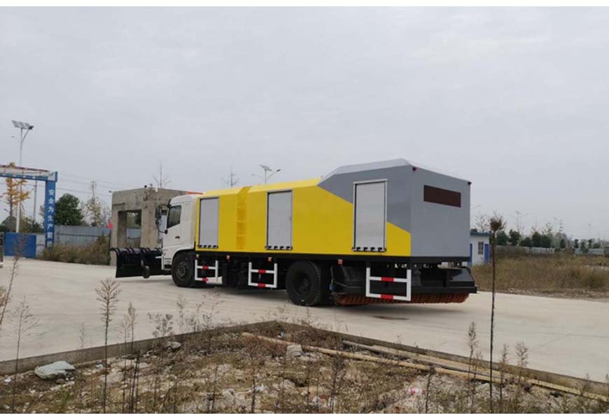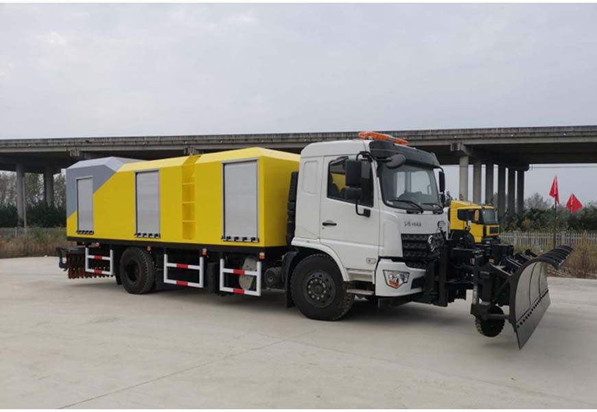 上裝配置 前置推雪鏟、中置破冰輥+除冰鏟、后置掃雪滾刷,150Kw副發動機,封閉式廂體結構帶中部爬梯,左右各 3 個鋁合金卷簾門,尾部配備雙大箭頭 LED 指示燈+LED 顯示屏,叁段式獨立避障,每段都具有自動上彈、自動復位的避障功能,具有浮動和隨路面仿形功能。除雪鏟鏟刃和破冰輥刀片高強度耐磨合金鋼,硬度 50-55HR。后置除雪滾刷,用聚丙烯刷毛和強性鋼絲混合制成。