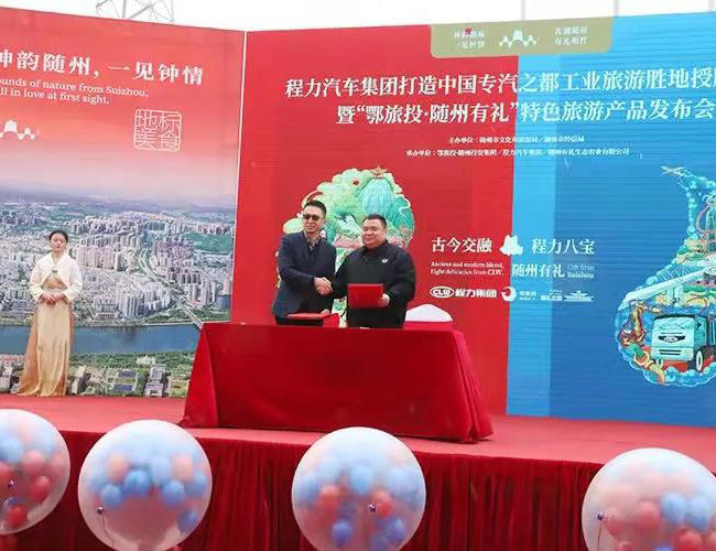 在程力工業(yè)旅游產(chǎn)品發(fā)布會(huì)上,程力汽車集團(tuán)總經(jīng)理程阿羅(左)與鄂旅投總經(jīng)理王濤,簽署了文化旅游戰(zhàn)略合作框架協(xié)議,雙方?jīng)Q定利用各自的優(yōu)勢(shì)強(qiáng)強(qiáng)聯(lián)合,共同開(kāi)發(fā)工業(yè)旅游潛在市場(chǎng),為隨州的經(jīng)濟(jì)發(fā)展增添新的動(dòng)能。